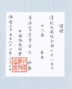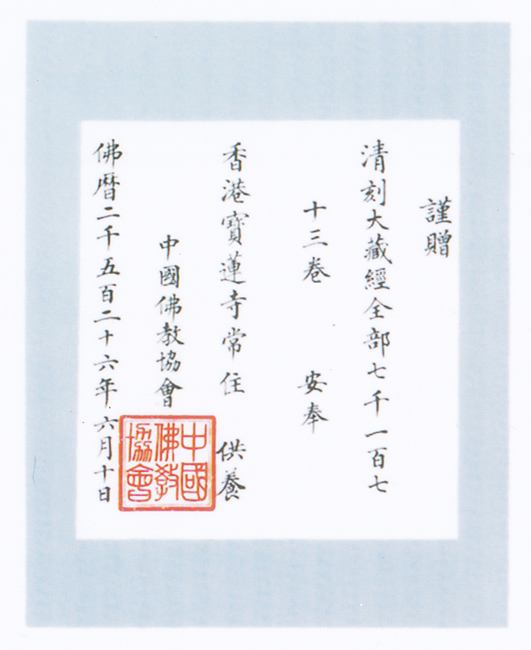 1982年6月, 香港寶蓮禪寺迎請大藏經代表團到北京,迎請《龍藏》;趙樸初會長主持贈經儀式。1982年10月,中國佛教協會派出護藏代表團,把《龍藏》護送至香港寶蓮禪寺。寶蓮禪寺與香港佛教聯合會舉行了盛大的迎接大藏經儀式,並同時舉辦了《龍藏》公開展覽。