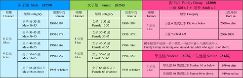 6公里、8公里所有組別及2公里學生組:$250